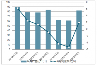 2018年2-9月中國白酒(折65度,商品量)各月當(dāng)月產(chǎn)量及同比增長走勢