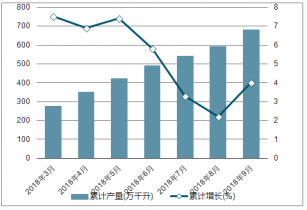 2018年1-9月,中國白酒(折65度,商品量)產(chǎn)量累計(jì)達(dá)683 (萬千升),累計(jì)同比增長4%.