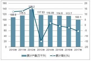 2010-2017年中國葡萄酒產(chǎn)量及同比比增長走勢