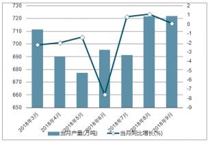 2018年2-9月中國(guó)硫酸(折100%)各月當(dāng)月產(chǎn)量及同比增長(zhǎng)走勢(shì)