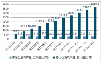 2017年12月中國液化石油氣產(chǎn)量為311.2萬噸,同比下降11.6%;2017年1-12月止累計中國液化石油氣產(chǎn)量為3677.3萬噸,同比增長4.5%。