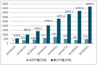 2018年2-9月中國原鹽各月當月產量及累計產量走勢