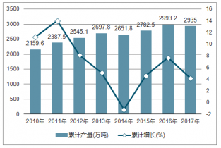 2010-2017年中國乳制品產(chǎn)量及同比比增長走勢