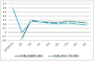 2018-1-9月全國快遞行業(yè)務(wù)量增速及業(yè)務(wù)收入增速走勢