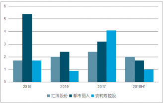 在凈利潤(rùn)方面,3家企業(yè)差距不大。同樣,在2016年都市麗人和安莉芳受營(yíng)收大幅縮小影響導(dǎo)致凈利潤(rùn)規(guī)模較2015年幾近腰斬,在2017年開始回升;2017年,安莉芳受匯兌收益和搬遷費(fèi)用補(bǔ)償刺激凈利潤(rùn)實(shí)現(xiàn)暴漲,并超過匯潔股份和都市麗人;匯潔股份凈利潤(rùn)規(guī)模增速趨勢(shì)較好,日漸有趕超都市麗人的勢(shì)頭。2018年上半年,匯潔股份實(shí)現(xiàn)凈利潤(rùn)2億元,位居行業(yè)第.一。