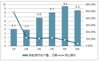 2018.1-6月中國新能源汽車產(chǎn)量及同比增長走勢