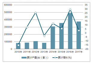 2010-2018年中國大氣污染防治設備產量及同比增長走勢