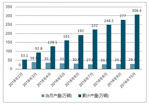 2018年2-10月中國載貨汽車各月當月產量及累計產量走勢