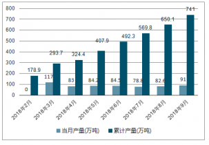2018年2-9月中國(guó)合成洗滌劑各月當(dāng)月產(chǎn)量及累計(jì)產(chǎn)量走勢(shì)