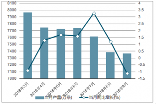 2018年2-9月中國(guó)橡膠輪胎外胎各月當(dāng)月產(chǎn)量及同比增長(zhǎng)走勢(shì)