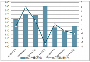 2018年2-9月中國塑料制品各月當(dāng)月產(chǎn)量及同比增長走勢