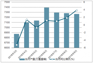 2018年2-9月中國(guó)平板玻璃各月當(dāng)月產(chǎn)量及同比增長(zhǎng)走勢(shì)