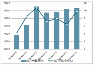 2018年2-9月中國鋼材各月當(dāng)月產(chǎn)量及同比增長走勢