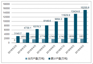 2018年2-9月中國鋼筋各月當月產量及累計產量走勢