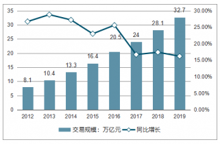 2012-2019年中國電子商務(wù)市場(chǎng)交易規(guī)模及同比增長(zhǎng)走勢(shì)