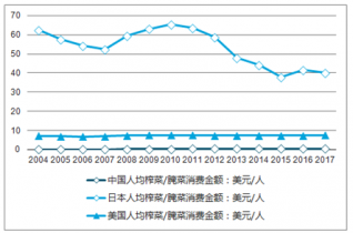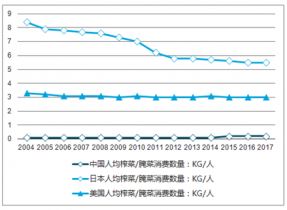 中國人均榨菜/腌菜消費數量對比(單位:美元/人,KG/人)