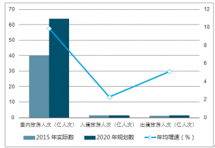 “十三五”期間國內(nèi)旅游人次、入境旅游人次、出境旅游人次及年增增速情況