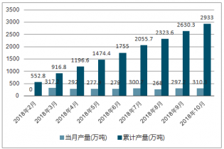2018年3-10月中國(guó)石腦油各月當(dāng)月產(chǎn)量及累計(jì)產(chǎn)量走勢(shì)