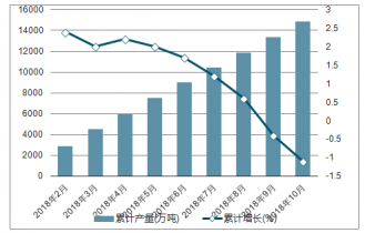 2018年2-10月中國柴油各月累計產(chǎn)量及同比增長走勢
