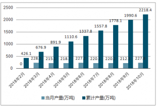 2018年3-10月中國(guó)石油焦各月當(dāng)月產(chǎn)量及累計(jì)產(chǎn)量走勢(shì)