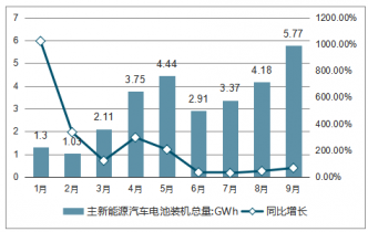 2018年1-9月新能源汽車電池裝機總量及同比增長走勢