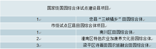 重慶市是全國首批開展田園綜合體試點建設(shè)的18個省區(qū)市之一。其中,忠縣被納入國家級田園綜合體試點建設(shè)縣,南川、潼南、梁平為市級試點區(qū)縣,形成了重慶市“1+3”田園綜合體建設(shè)的總體布局。建設(shè)周期為3年。整體來看,重慶市的四個田園綜合體試點區(qū)縣主要依托政策、資金、技術(shù)支持,把原有的特色產(chǎn)業(yè)做大做強,在此基礎(chǔ)上進行文旅開發(fā)和“三產(chǎn)”融合。在試點中,重慶市總結(jié)出重慶田園綜合體建設(shè)的“三化”(農(nóng)田田園化、產(chǎn)業(yè)融合化、城鄉(xiāng)一體化);“四新”(產(chǎn)業(yè)新業(yè)態(tài)、區(qū)域新生態(tài)、城鄉(xiāng)新生活、開發(fā)新格局);“三融合”(產(chǎn)業(yè)融合、要素融合、城鄉(xiāng)融合);“兩夢想”(城里人的山水田園夢和鄉(xiāng)里人的現(xiàn)代鄉(xiāng)村夢)等理念。