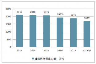2018三季度中國出口建筑用陶瓷1687萬噸,同比下降3.7%,2013年以來中國建筑用陶瓷出口數(shù)量情況,年均復(fù)合增長率為-2.9%。