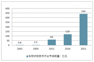 中國生物特征識別市場規(guī)模保持高速增長,近幾年中國將在信息技術、信息安全、金融交易、社會安全等領域推動生物特征識別標準化工作,產(chǎn)業(yè)潛力巨大。2002至2015年,國內生物識別市場的年復合增長率達到50%,2016年生物識別市場規(guī)模達到120億元左右。預計到2021年,中國生物識別行業(yè)的市場規(guī)模將突破340億元。