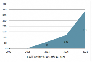 中國生物特征識別市場規(guī)模保持高速增長,近幾年中國將在信息技術(shù)、信息安全、金融交易、社會安全等領(lǐng)域推動生物特征識別標(biāo)準(zhǔn)化工作,產(chǎn)業(yè)潛力巨大。2002至2015年,國內(nèi)生物識別市場的年復(fù)合增長率達到50%,2016年生物識別市場規(guī)模達到120億元左右。預(yù)計到2021年,中國生物識別行業(yè)的市場規(guī)模將突破340億元。