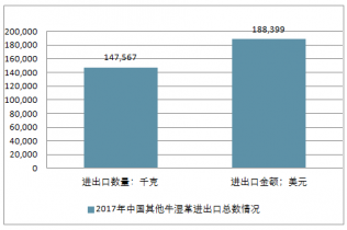 2018年中國其他牛濕革進(jìn)出口總量147567千克,進(jìn)出口總金額188399美元。