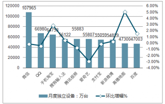 2018年10月移動應用APP獨立設備數量排行榜中。前十名分別為微信、QQ、手機淘寶、搜狗輸入法、騰訊視頻、愛奇藝、支付寶、新浪微博、高德地圖、百度,其中微信月度獨立設備數量位居榜首,為107965萬臺,環比下降0.1%;排名第二的是QQ,月度獨立設備數量為66980萬臺,環比下降0.4%;排名第三的是手機淘寶,月度獨立設備為64753萬臺,環比增長2.9%。