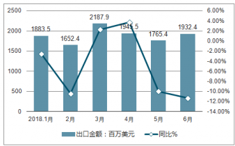 2018年各月中國液晶顯示板出口金額及增長走勢