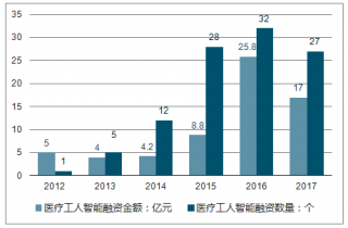 2012-2018年中國醫(yī)療工人智能融資金額及數(shù)量走勢(shì)