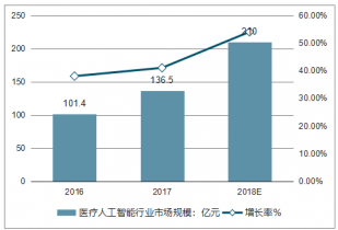 2018年中國醫(yī)療人工智能行業(yè)市場規(guī)模達(dá)到136.5億元,增長率為41%;醫(yī)療人工智能應(yīng)用的不斷深入,市場規(guī)模將進(jìn)一步增長,預(yù)計(jì)2018年市場規(guī)模有望突破200億元。