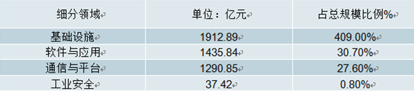 2018年中國(guó)工業(yè)互聯(lián)網(wǎng)細(xì)分領(lǐng)域結(jié)構(gòu)情況中,基礎(chǔ)設(shè)施規(guī)模達(dá)到1912.89億元,占總規(guī)模的40.9%;軟件與應(yīng)用規(guī)模達(dá)到1435.84億元,占比為30.7%;通信與平臺(tái)的規(guī)模為1290.85億元,占比為27.6%;工業(yè)安全為37.42億元,占總規(guī)模的0.8%。