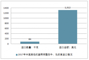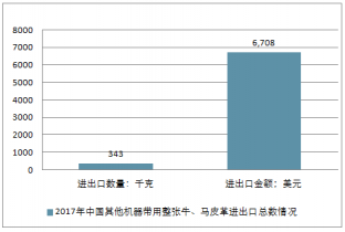 2017年中國其他機器帶用整張牛、馬皮革進出口總量343千克,進出口總金額6,708美元。