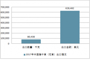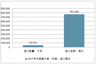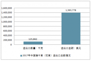 2017年中國山羊或小山羊干革(坯革)進出口總量125,862千克,進出口總金額1,393,778美元。