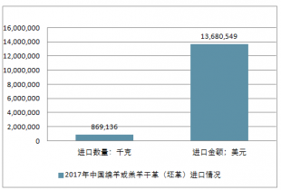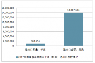 2017年中國其他綿羊或羔羊濕革進出口總量883,654千克,進出口總金額13,967,634美元。