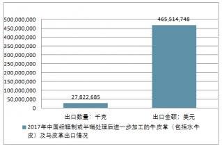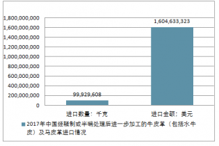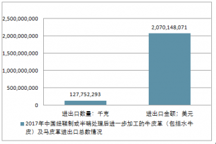 2017年中國經鞣制或半硝處理后進一步加工的牛皮革(包括水牛皮)及馬皮革進出口總量127,752,293千克,進出口總金額2,070,148,071美元。