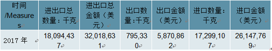 2017年中國(guó)經(jīng)鞣制的其他不帶毛動(dòng)物皮及其坯革進(jìn)出口總量18,094,437千克,進(jìn)出口總金額32,018,631美元。