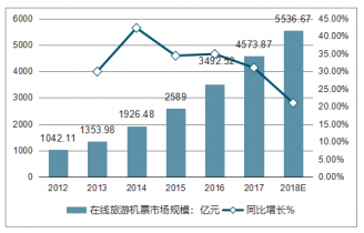 2012-2018年中國在線旅游機(jī)票市場規(guī)模及同比增長走勢