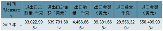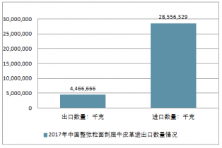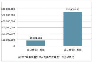 2017年中國整張粒面剖層牛皮革進出口總量33,022,995千克,進出口總金額639,791,601美元。