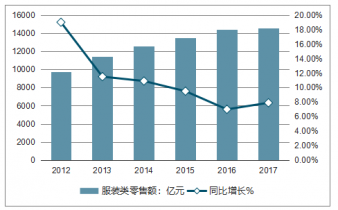 2012-2017年全國服裝類零售額及同比增長走勢(shì)