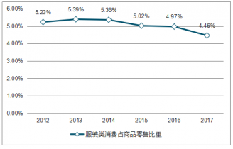2012-2017年全國服裝類消費(fèi)占商品零售比重情況