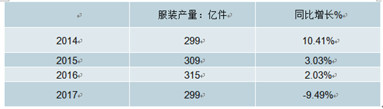 2014-2017年中國服裝產(chǎn)量及同比增長走勢(shì)