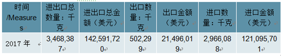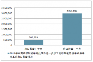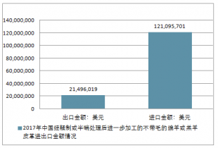2017年中國經鞣制或半硝處理后進一步加工的不帶毛的綿羊或羔羊皮革進出口總量3,468,387千克,進出口總金額142,591,720美元。
