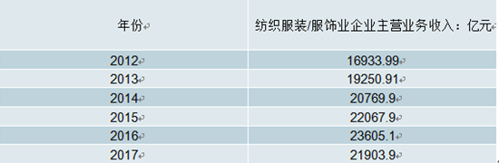 2012-2017年中國紡織服裝/服飾業企業主營業務收入