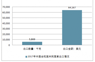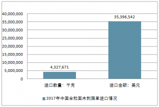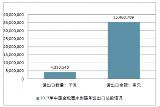 2017年中國全粒面未剖層革進出口總量4,333,540千克,進出口總金額35,460,709美元。