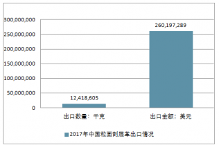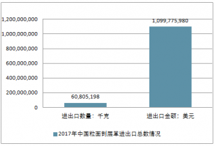 2017年中國粒面剖層革進出口總量60,805,198千克,進出口總金額1,099,775,980美元。