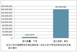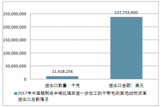 2017年中國鞣制或半硝處理后進(jìn)一步加工的不帶毛的其他動(dòng)物皮革進(jìn)出口總量11,428,256千克,進(jìn)出口總金額237,733,930美元。